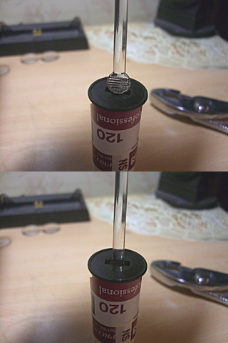 スプールを入れて外箱をかぶせた時、フィルム送り軸がまっすぐスプールの穴に届くように。