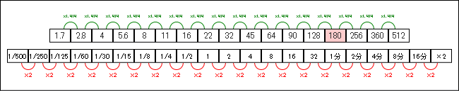 シャッタースピードにはこの表にない1/400秒とか1/13秒とか4.25秒とかもあるわけですが。